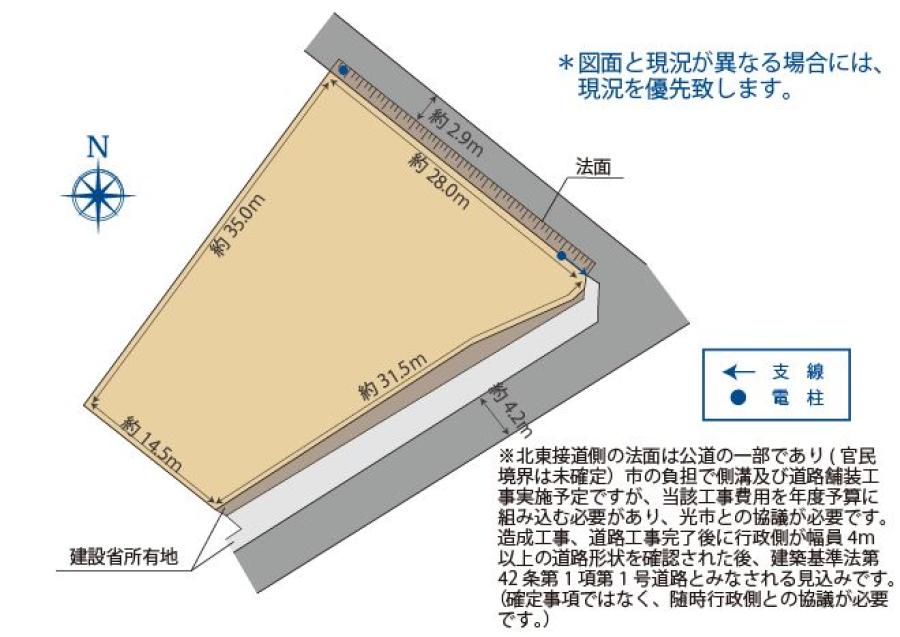 - 南東側幅員約4.2mの公道に建設省所有地を介し約31.5m接し、北東側幅員約2.9mの公道(建築基準法の道路には該当しない)に法面を介し約28.0m接する。