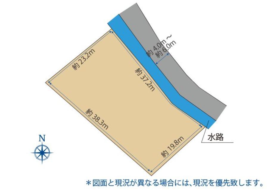 - 北東側幅員約4.0m~約6.0mの公道に水路を介して約37.2m接する。
