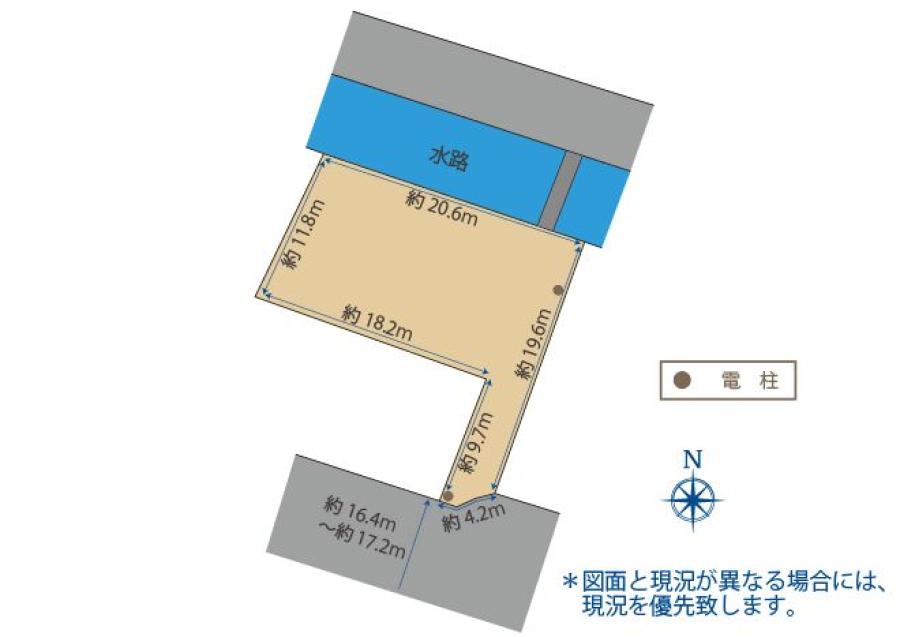 - 南西側幅員約16.4m~約17.2mの公道に約4.2m接する。