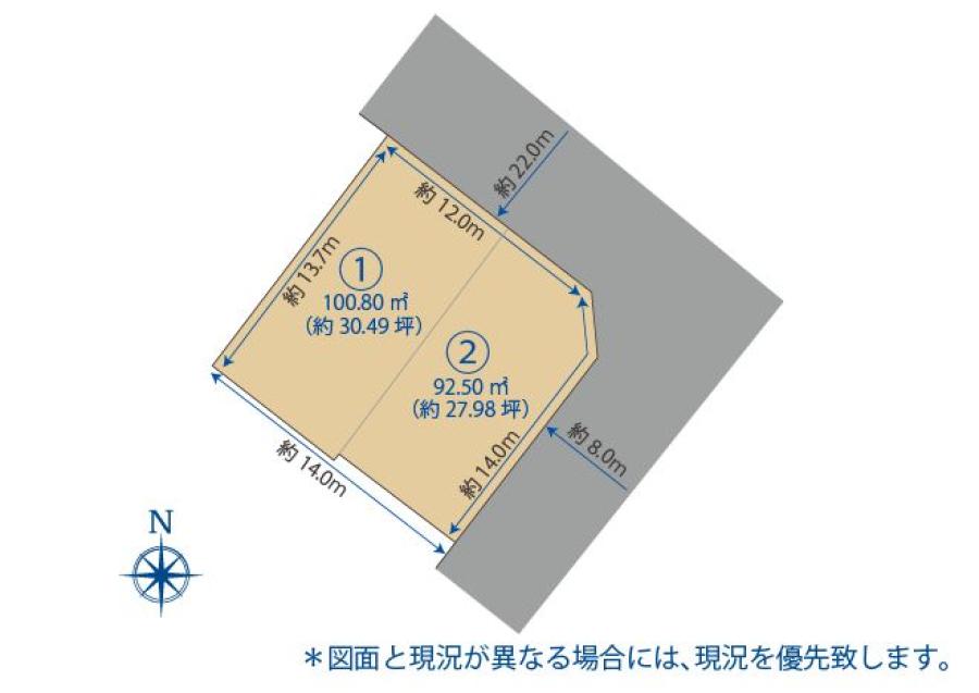 - 北東側幅員約22.0mに公道に約12.0m接し、南東側幅員約8.0mの公道に約14.0m(角切部分含む)接する。