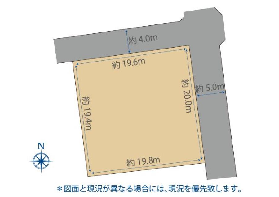 - 東側幅員約5.0mの公道に約20.0m接し、北側幅員約4.0mの公道に約19.6m接する(一部高低差あり)。