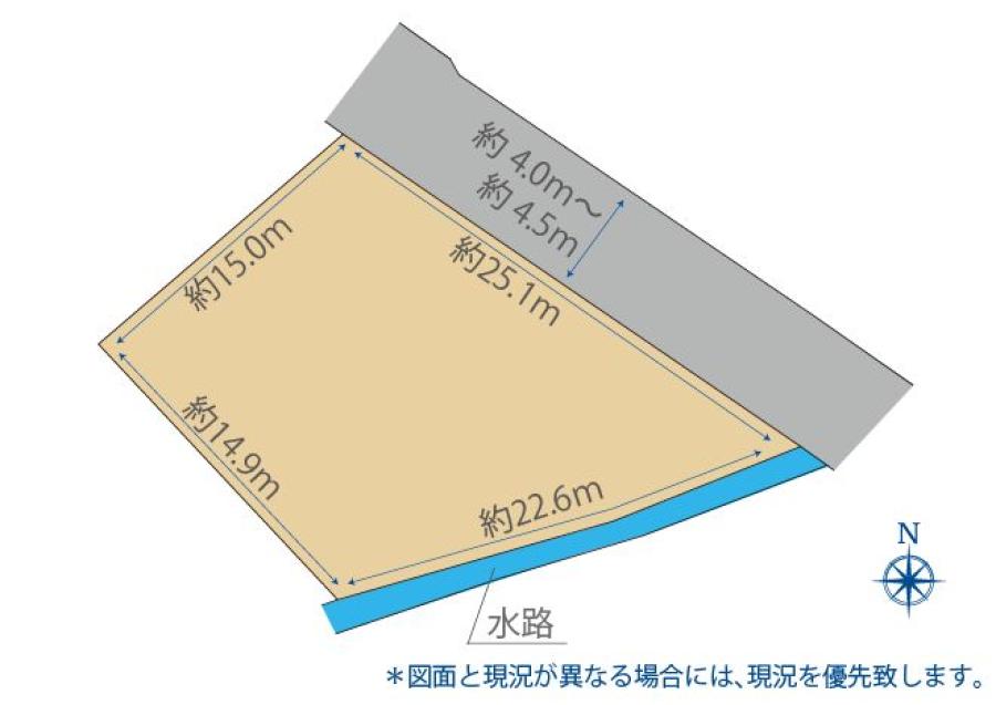 - 北東側幅員約4.0m~約4.5mの公道に約25.1m接する。