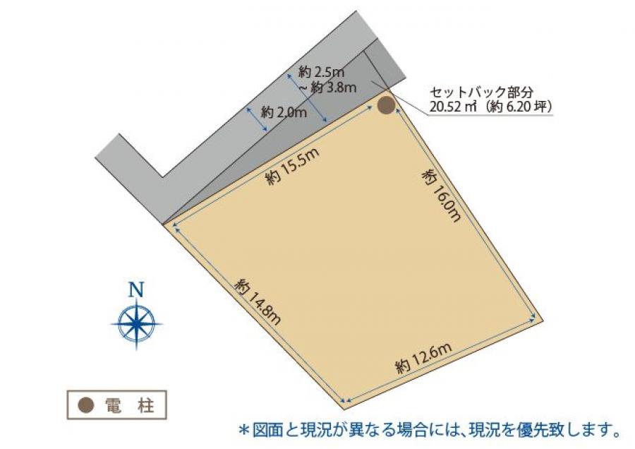 - 北西側幅員約2.0mの公道にセットバック部分を介して約15.5m接する。