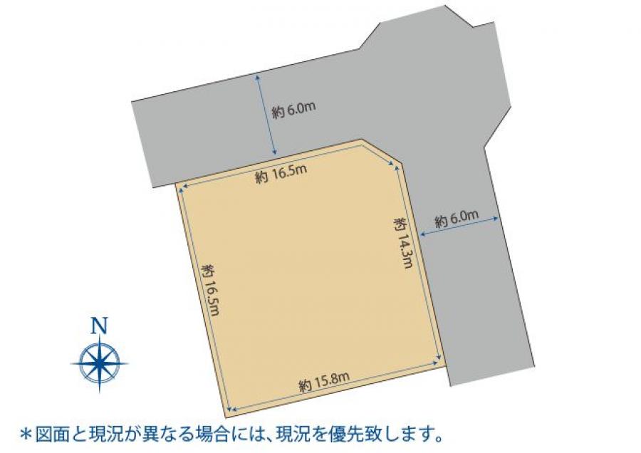 - 東側幅員約6.0mの公道に約約14.3m接し、北側幅員約6.0mの公道に約16.5m(角切部分含む)接する。