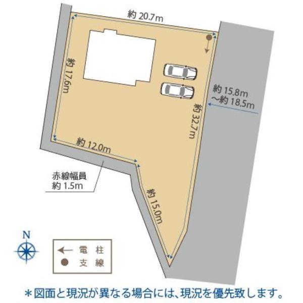 - 東側幅員約15.8m~約18.5mの公道に約32.7m接する。