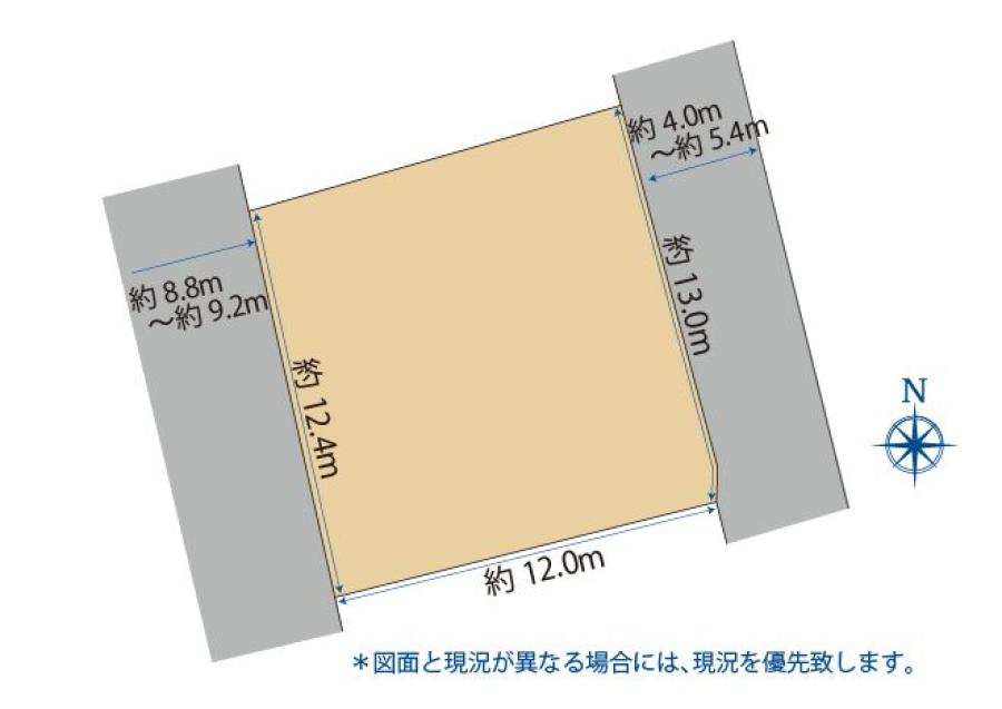 - 南西側幅員約8.8m~約9.2mの公道に約12.4m接し、北東側幅員約4.0m~約5.4mの公道に約13.0m接する。